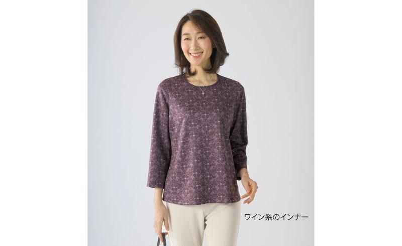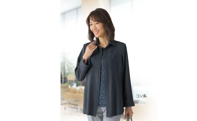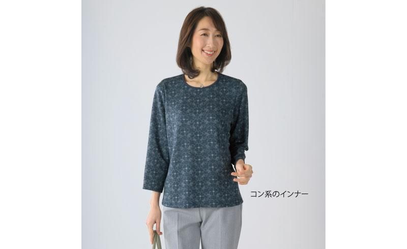 デニム調のプリントを施したアンサンブルです。素材自体はやわらかなニットなので、デニムの印象をラクな着心地でお楽しみいただけます。キリリとした衿付きジャケットから、やさしい花柄プリントのインナーがのぞきます。高めの位置の胸ポケットがアクセント。縦の切替がすっきりと見せてくれます。