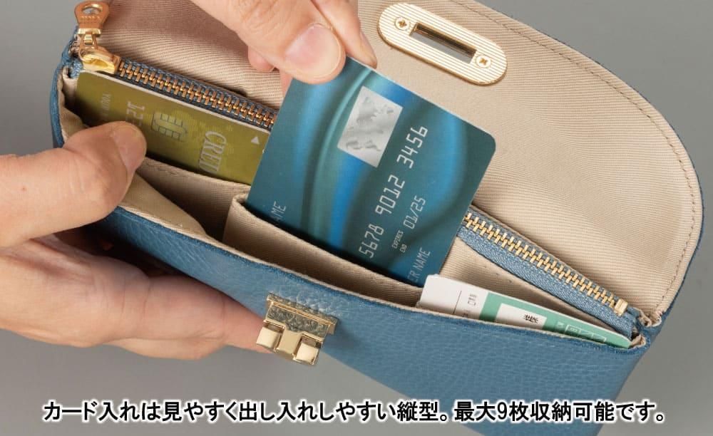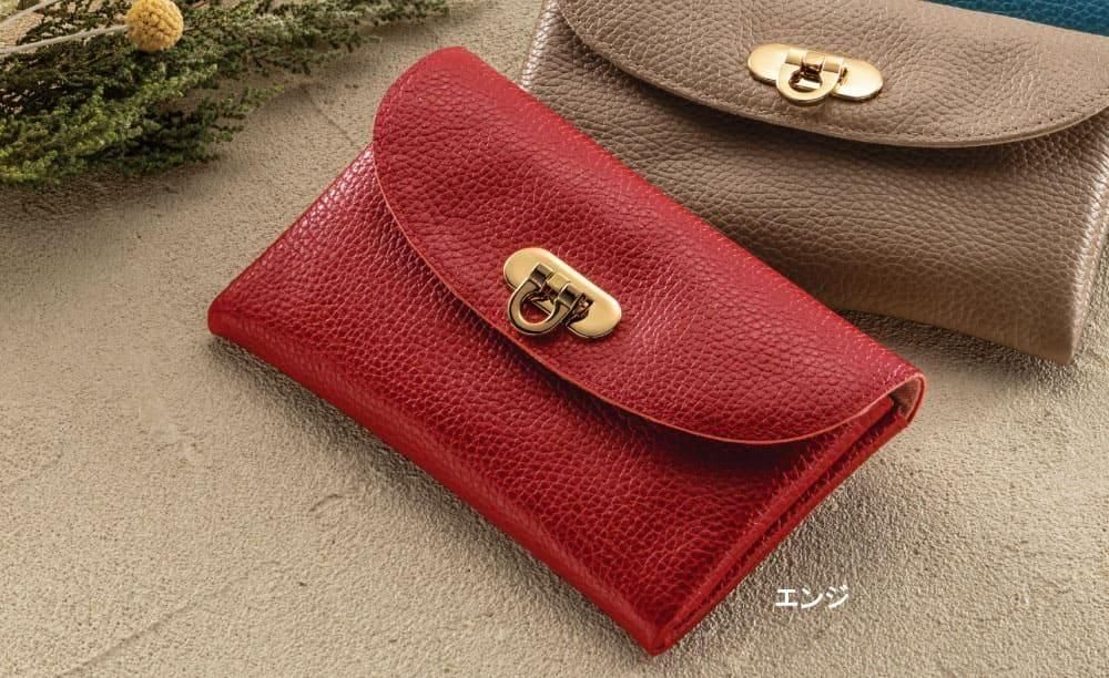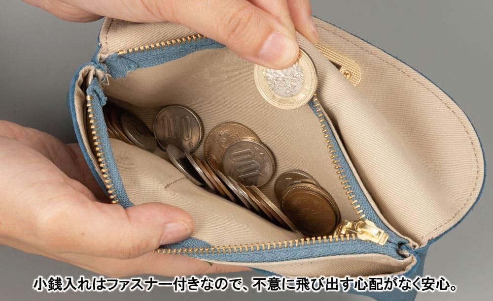 かぶせ式で開け閉め簡単、掴みやすい大きめの金具付きです。お札、小銭、カード入れを一度に見ることができるので、お会計の際もスムーズ。