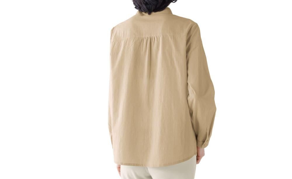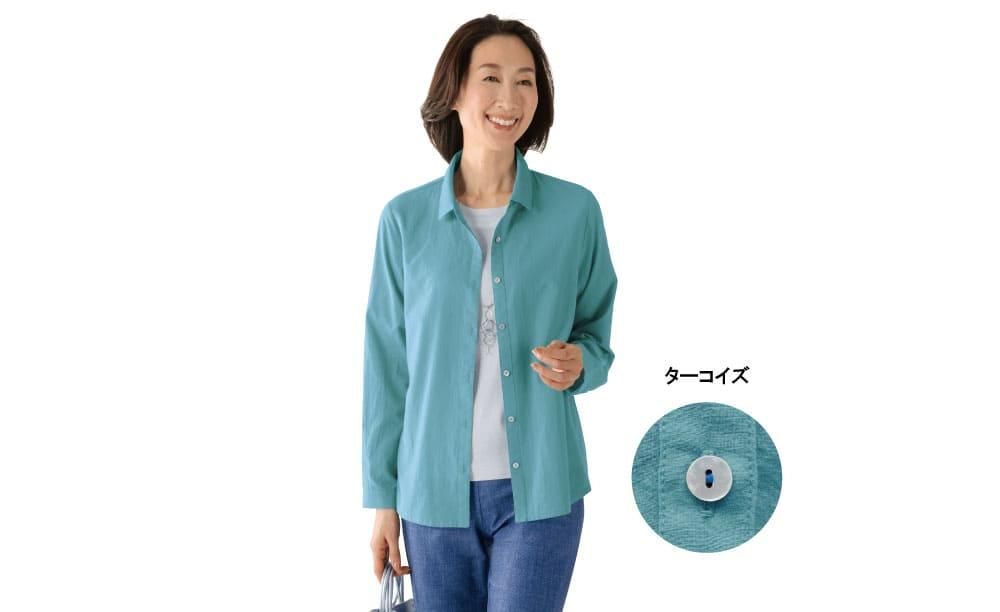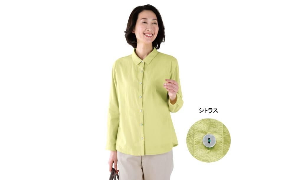 春を感じさせる明るい色合いが魅力のコットンブラウスです。ソフトな肌あたりが心地よく、自然なシワ感はやさしい表情をプラスしてくれます。
