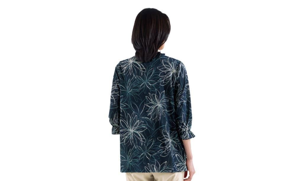 さらりと軽やかな着心地で夏を快適に。線画調の花柄プリントや、衿もとと袖口のフリルがさりげない華やぎを添えます。適度な伸縮性があり、サラリとした肌ざわりの素材「エスパンディ」を使用。