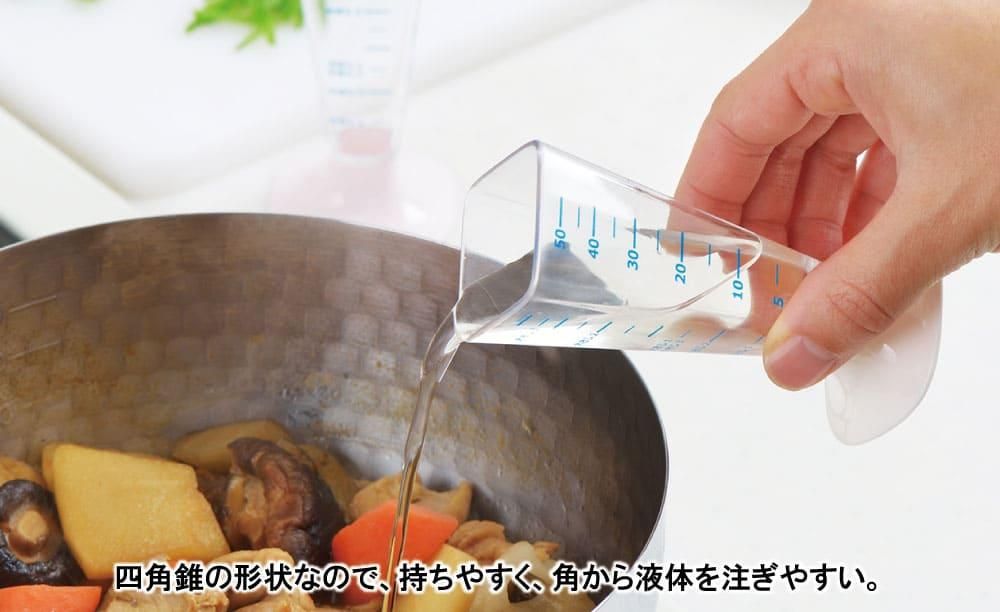 置いて計量できるからこぼす心配もなし!哺乳瓶などにも使われている軽くて丈夫な素材を使用。熱湯消毒や食洗機にも対応しています。