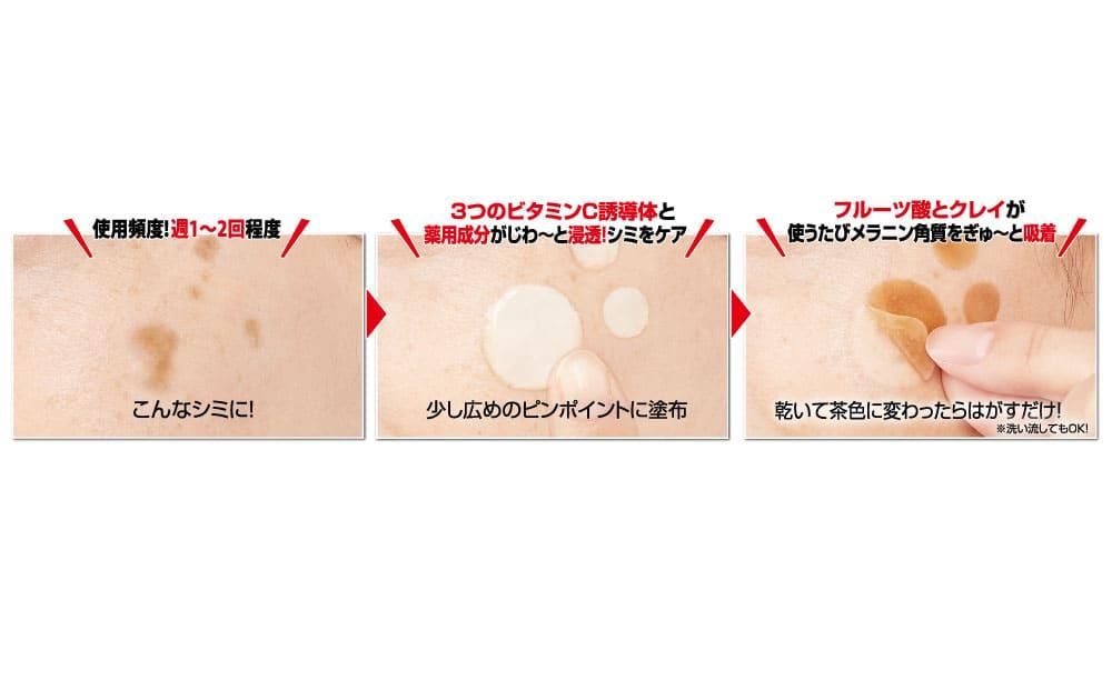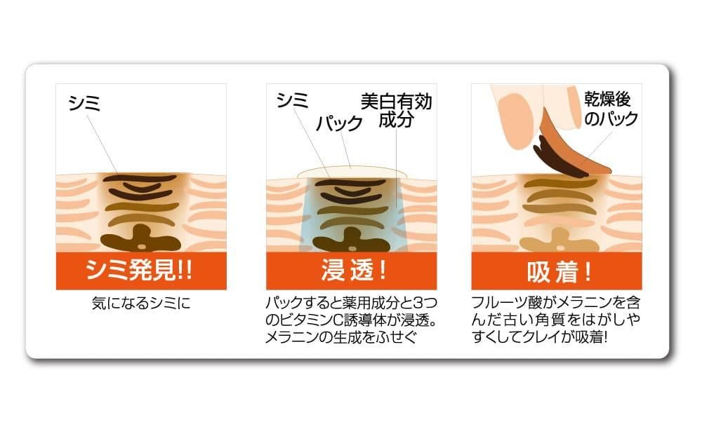 メラニン角質(※)を吸着しながら集中美白!薬用成分とビタミンC誘導体でシミを予防しながらフルーツ酸のピーリング効果とクレイの吸着効果で今あるシミもケア!※メラニンを含んだ角質