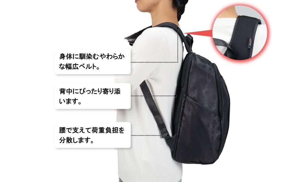 肩や腰の負担を軽減するために、人間工学に基づいて設計されたリュック。荷物を入れて歩いてもリュックが揺れにくいため、体がブレずにラクに。普段使いにも、いざという時にも頼りになるアイテムです。