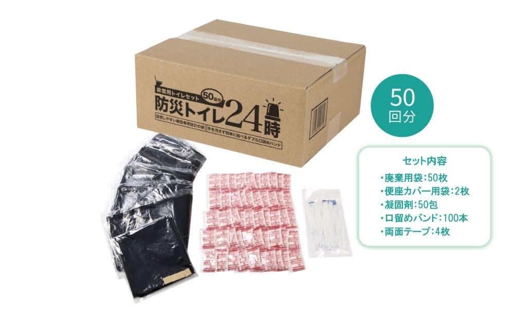 洋式トイレにかぶせて使う袋と凝固剤、口留めバンドのシンプルなセットです。50回分と安心の大容量。