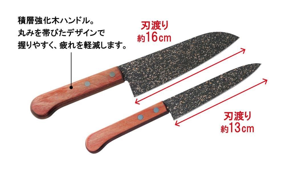 三重県の世界的コーティングメーカー・オキツモ社が開発した特殊コーティングを刃部に施し、表面の凹凸で食材が離れやすい仕様に。