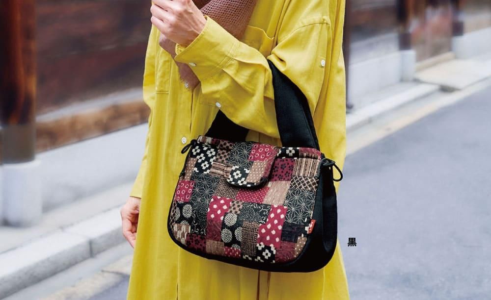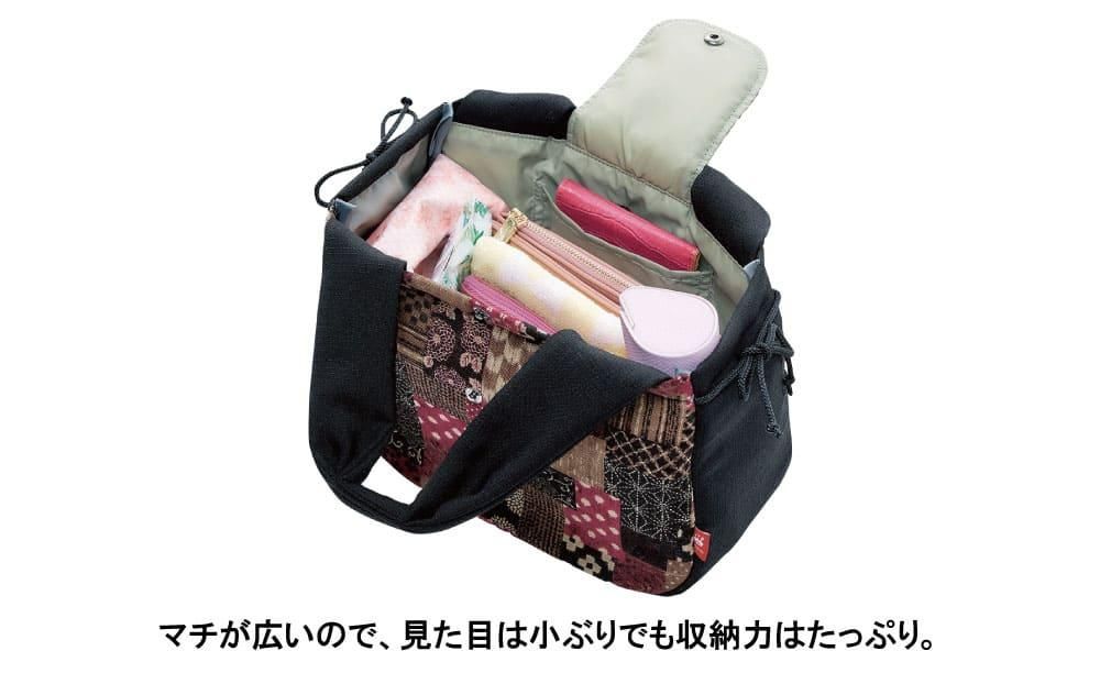 マチ付きトートバッグ。複数の和柄を組み合わせ、パッチワーク風に。内側全体にやわらかなウレタンを入れ、やさしい手ざわりに仕上げています。