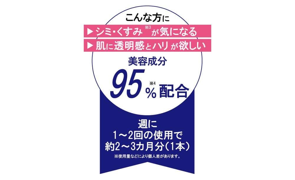 シミの元(※1)を絡めとる!美白(※2)に効果のある成分”プラセンタエキス”配合。シミ・くすみ(※3)が気になる方に。肌に透明感とハリが欲しい方に。 週に1〜2回の使用で約2〜3カ月分(1本) ※使用量などにより個人差があります。 ※1 メラニンを含む古い角質のこと ※2 メラニンの生成を抑え、しみ・そばかすを防ぐこと ※3 古い角質のこと ※4 精製水含む