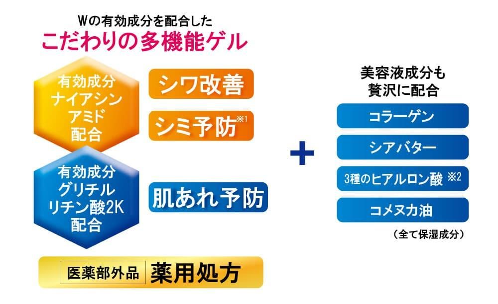 角質層まですーっと浸透。ふっくらハリ肌!Wの有効成分を配合したこだわりの多機能ゲル+美容液成分も贅沢に配合。 ※1 メラニンの生成を抑え、しみ・そばかすを防ぐこと ※2 ヒアルロン酸Na-2、アセチル化ヒアルロン酸ナトリウム、加水分解ヒアルロン酸