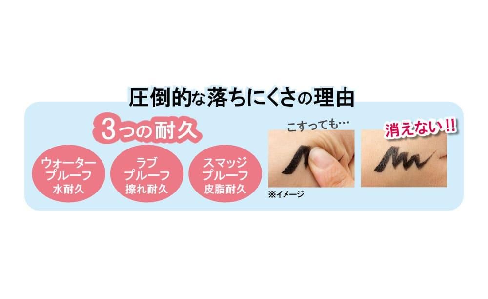 圧倒的な落ちにくさの理由は3つの耐久。 ・ウォータープルーフ…水耐久 ・ラブプルーフ…擦れ耐久 ・スマッジプルーフ…皮脂耐久