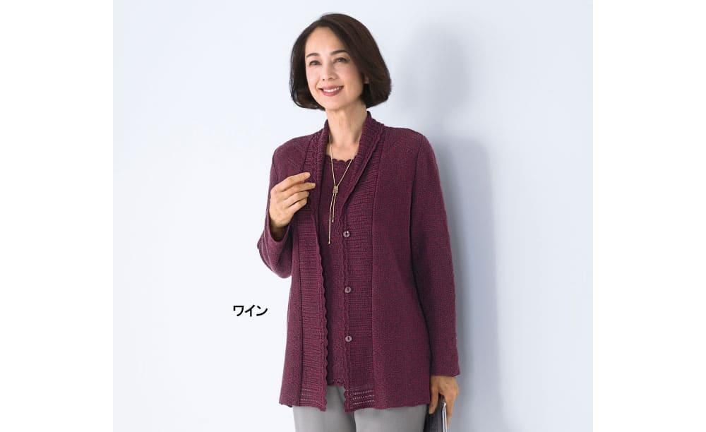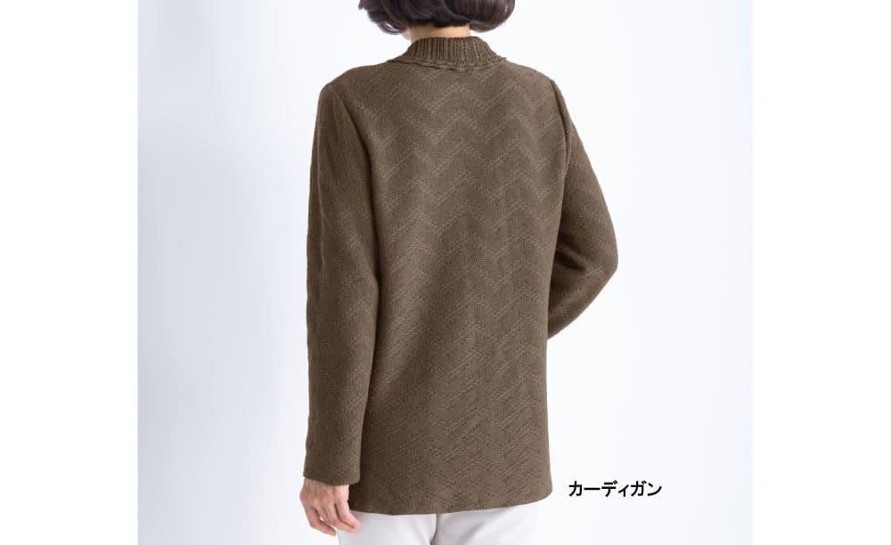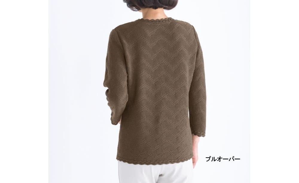 細やかで繊細な編柄を組み合わせた上品な雰囲気のアンサンブルです。カーディガンの衿から前立て、そしてプルオーバーの衿もとや裾のデザインは、女性らしく優しい印象をプラスしてくれます。保温性があり暖かなウール混素材を使用。やわらかな風合いと、やさしいぬくもりで体を心地よく包み込んでくれます。モカ、ワインともに色に深みがあり、上品さを一層引き立たせます。