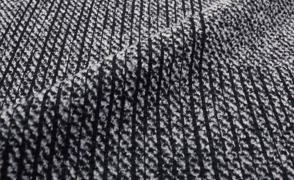 身頃に入った切替と、ウエストの切替部分に入ったギャザーが美しく、きれいなシルエットを生み出します。ふくらみのあるブークレー糸を使った、ふんわりとしてやさしい風合いも魅力です。