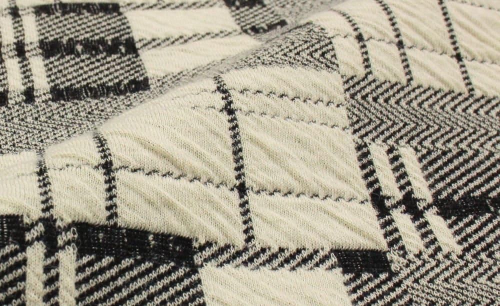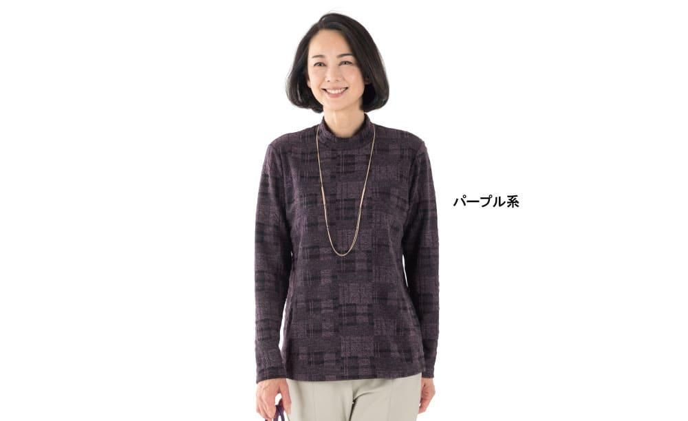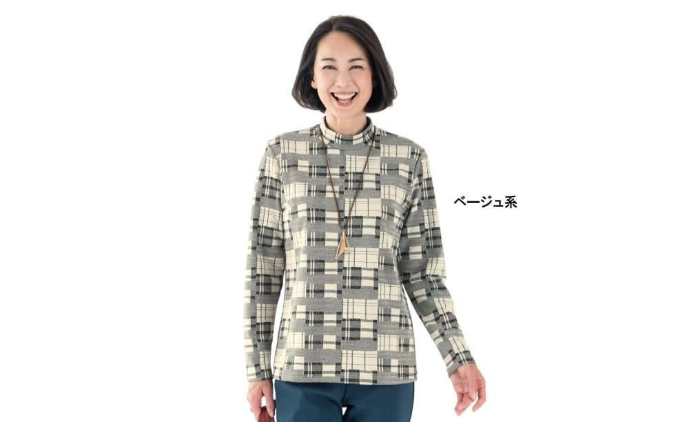 ジャガード編みで表現したブロック柄が目を惹く一枚。ふくれ編みの立体感が奥行きをプラスしてくれます。ふっくらとやわらかな素材です。やさしい肌あたりでストレスフリーなのも魅力。適度なストレッチ性もあり、着心地が快適です。