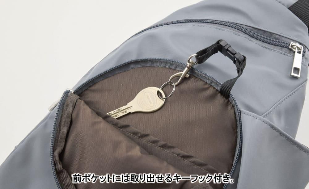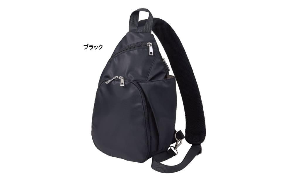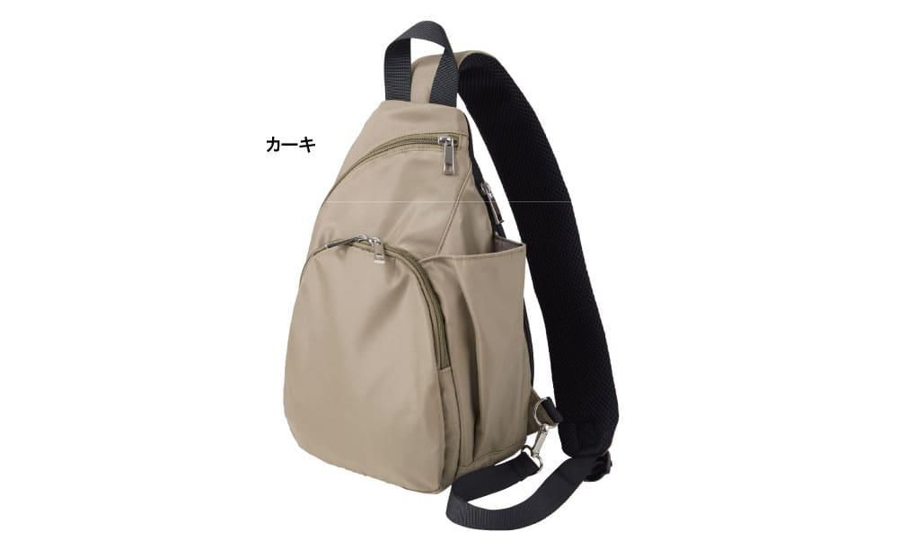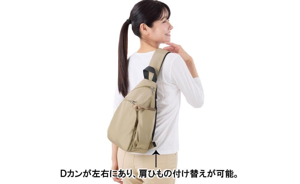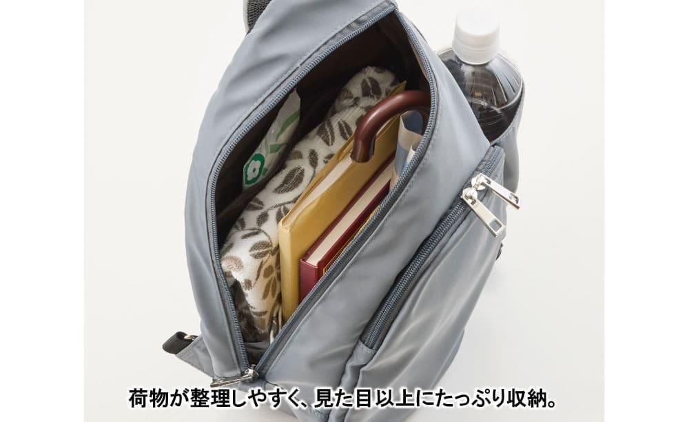 左右の肩どちらにも掛けられ、背負ったまま荷物が取り出せます。メイン収納は貫通ファスナーで左右どちらからでも出し入れOKです。