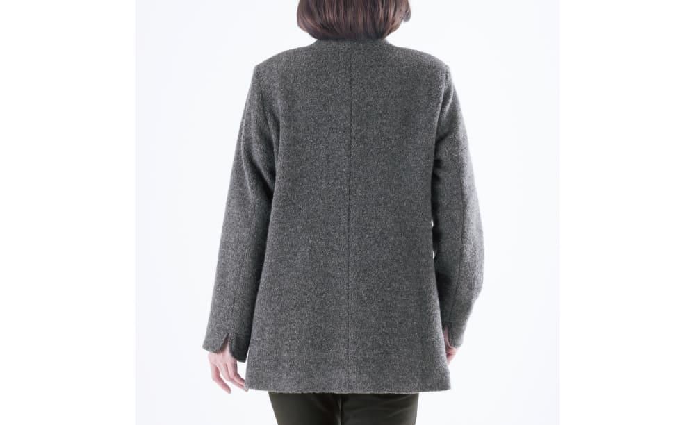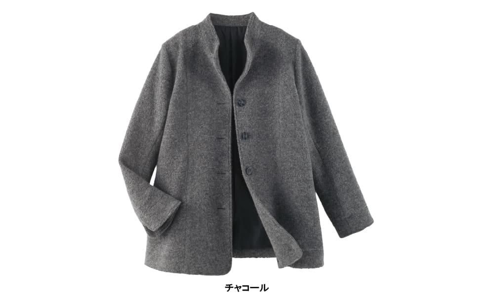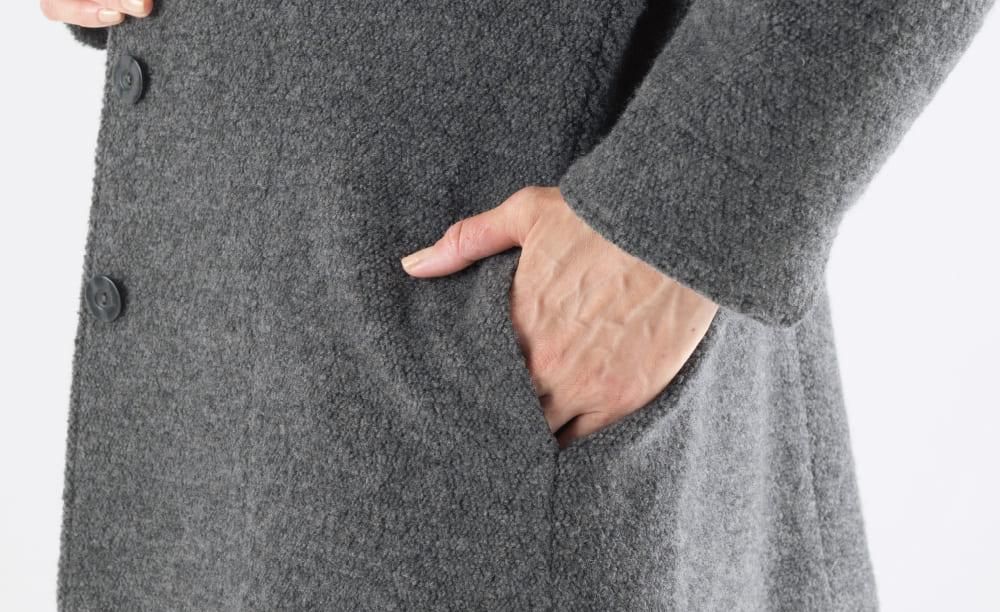 やわらかなウール混素材を使用したコート。ふんわりと軽く、風を通しにくいので颯爽と歩けます。車内や室内でも着たままでいられる丈感もポイントです。伝統的な毛織物産地・尾州で織られた素材です。ウールをくるくるとパイル状に織り上げているので、空気を含んであったか。肌ざわりも心地よく、やわらかです。
