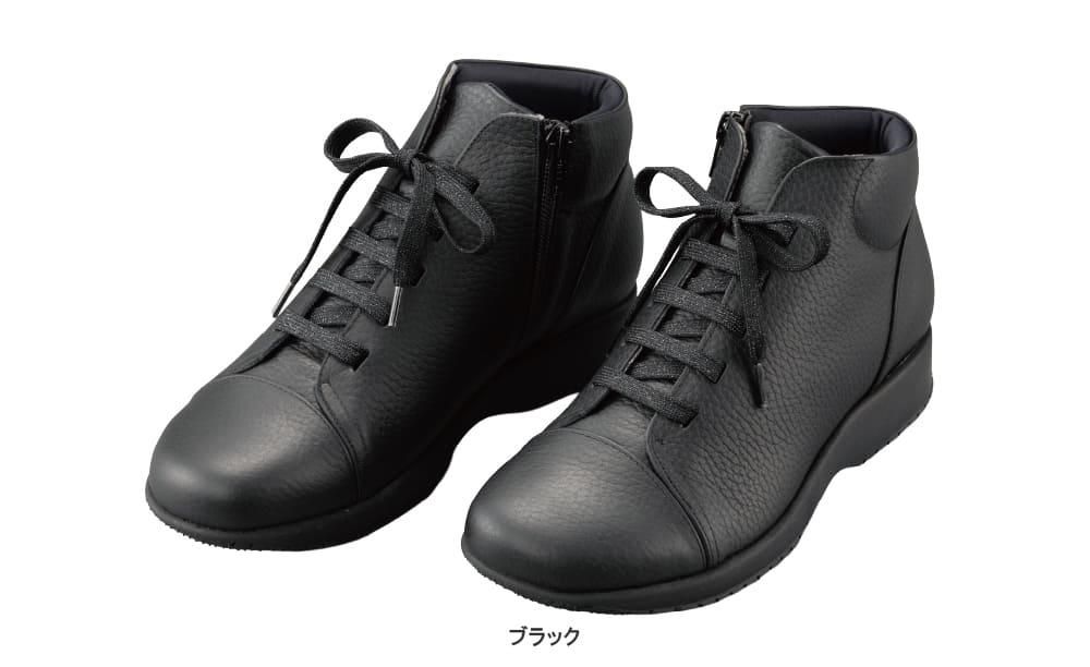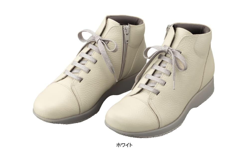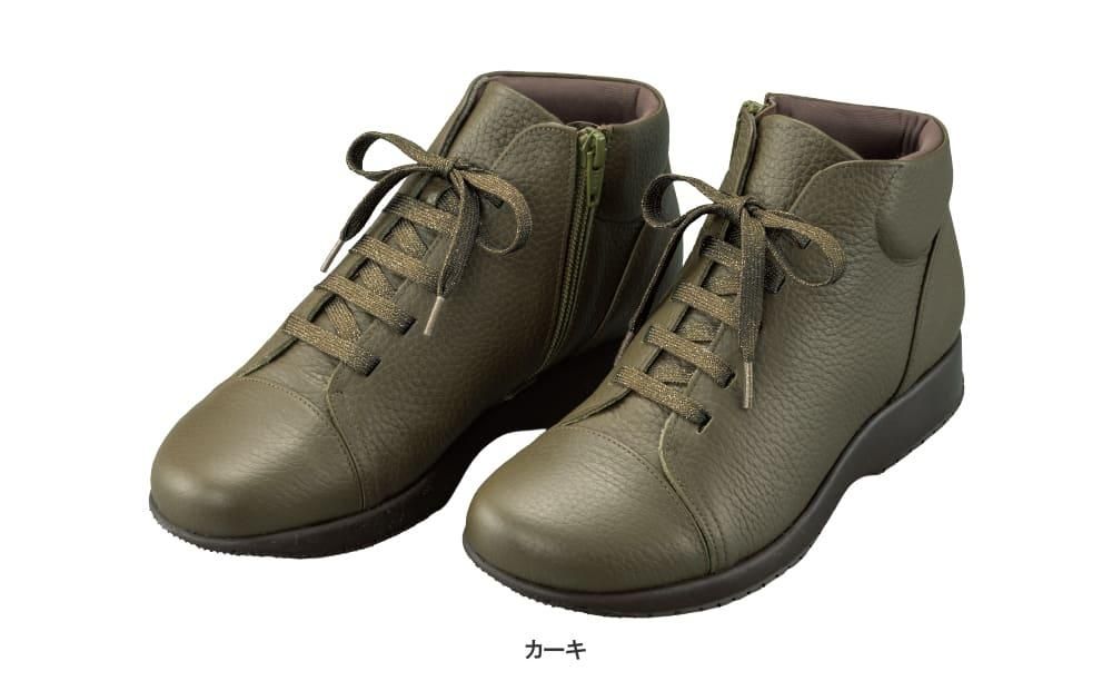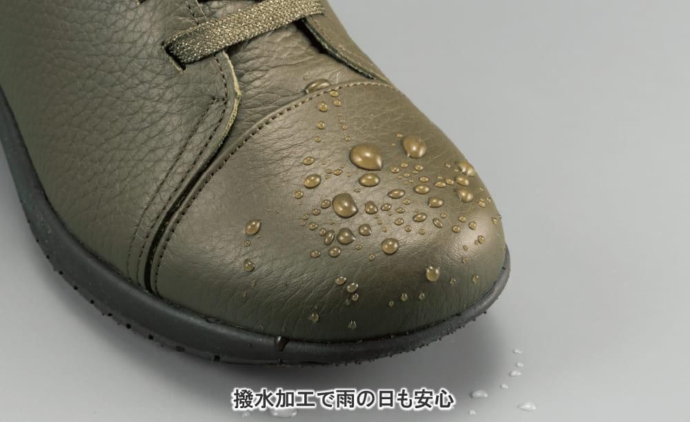 レザーブーツのようでありながら、優れた屈曲性と弾力性で、快適な歩行をサポートするスニーカー。ラメ入りの靴紐がさり気なく華を添えます。甲の革に撥水加工を施しているので、突然雨が降っても安心です。弾力性とグリップ力のあるゴム底を使用し、すべりにくく長時間の歩行も快適です。