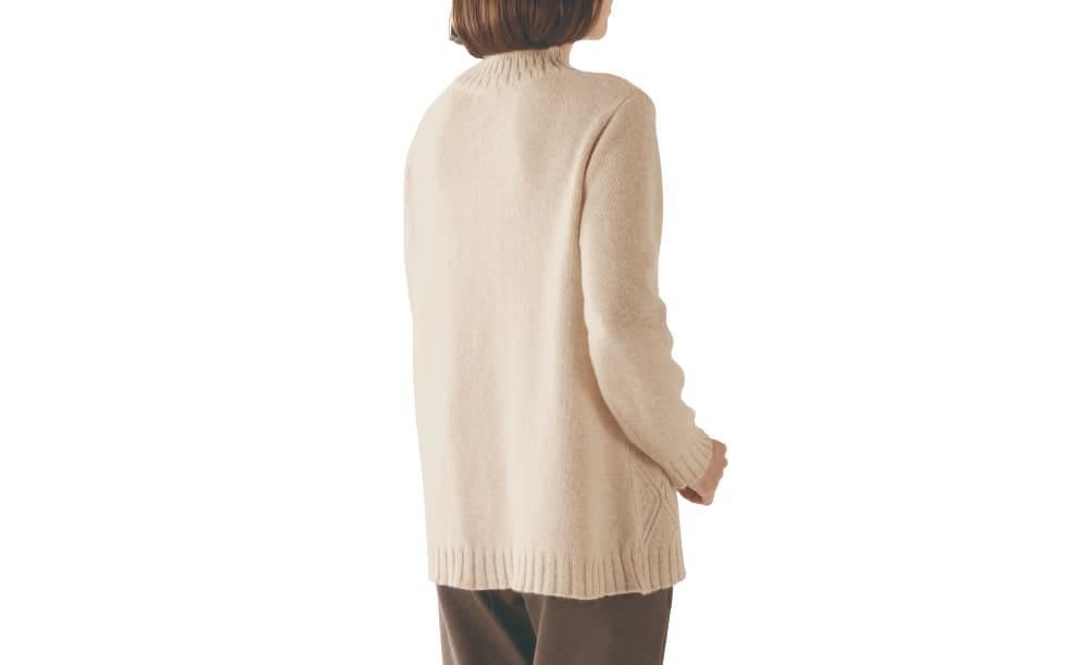 着心地も見た目もぬくもりたっぷりのセーター。前身頃に入ったダイヤ柄がすっきりと見せてくれながらも、裾に向かってやや広がるシルエットでゆったりと着ることができます。ウールとアンゴラをミックスしているので軽くて保温性が高いのが魅力。杢糸を使い、やさしい雰囲気に仕上げました。