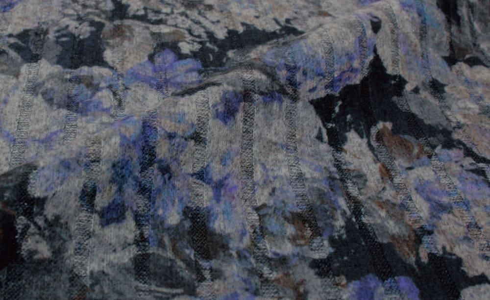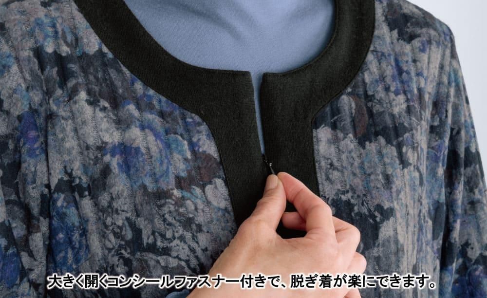暖かさとソフトな肌触りの良さが心地いい起毛仕立てのリブニット素材。そこに立体感のある繊細な花柄をプリントしているので、色柄に奥行きが生まれ高級感があります。また、衿から胸元にかけての配色が引き締まった印象を与え、上品な雰囲気をプラスしてくれます。
