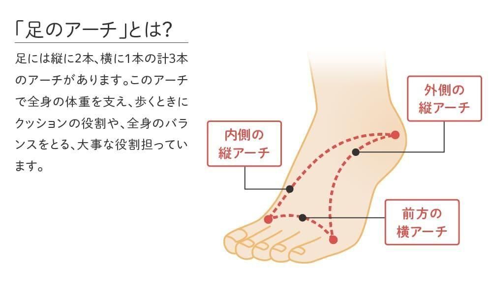 横アーチ部分を引き締める、独自設計のサポート構造「横アーチサポート」。締め付けすぎない、ちょうどいいサポート力に調整しました。足の指が開きやすくなり、しっかり地面をつかめるようなアーチ形状に整えます。