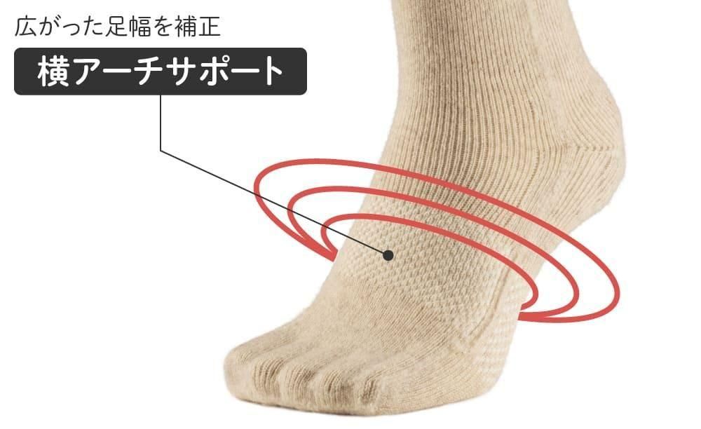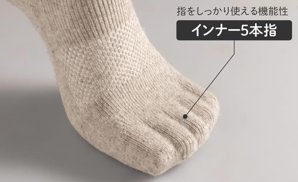 足先は5つの立体的な部屋状に仕切られた「インナー5本指」構造。各指を入れるスペースが連結しているから、通常の5本指靴下よりも指が真っ直ぐに伸びやすく、正しい位置に整えます。