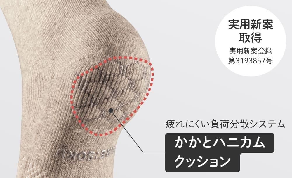 独自の「かかとハニカムクッション」が、かかとから関節や筋肉へ伝わる衝撃を大幅に軽減します。さらにかかと位置を少し上げることで、縦アーチをサポートし、かかとに偏りがちな重心バランスを整えます。(実用新案取得実用新案登録第3193857号)