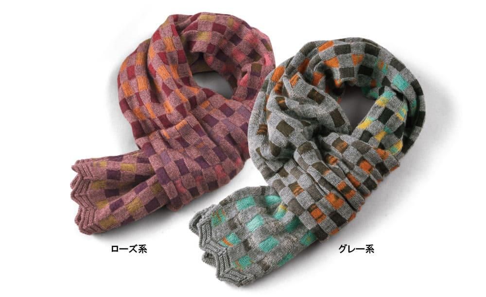 ブロック柄が装いに彩りを添えるマフラー。ふっくらやわらかな風合いで、首元をあたためます。ほんのりあたたかなウール入りです。
