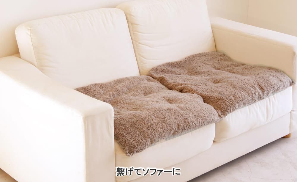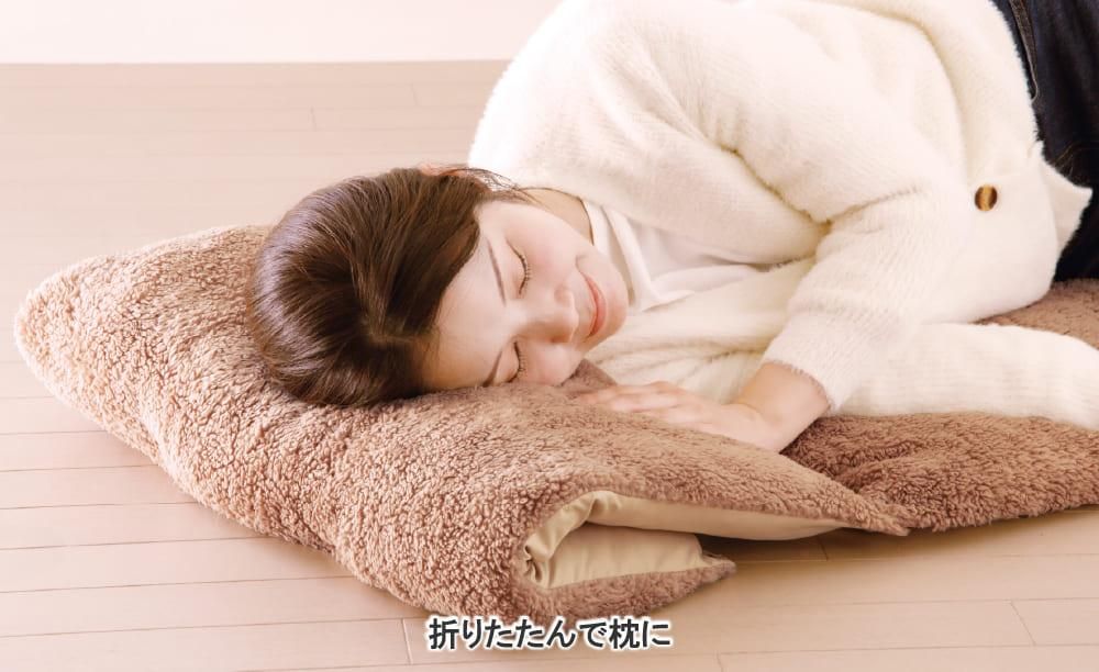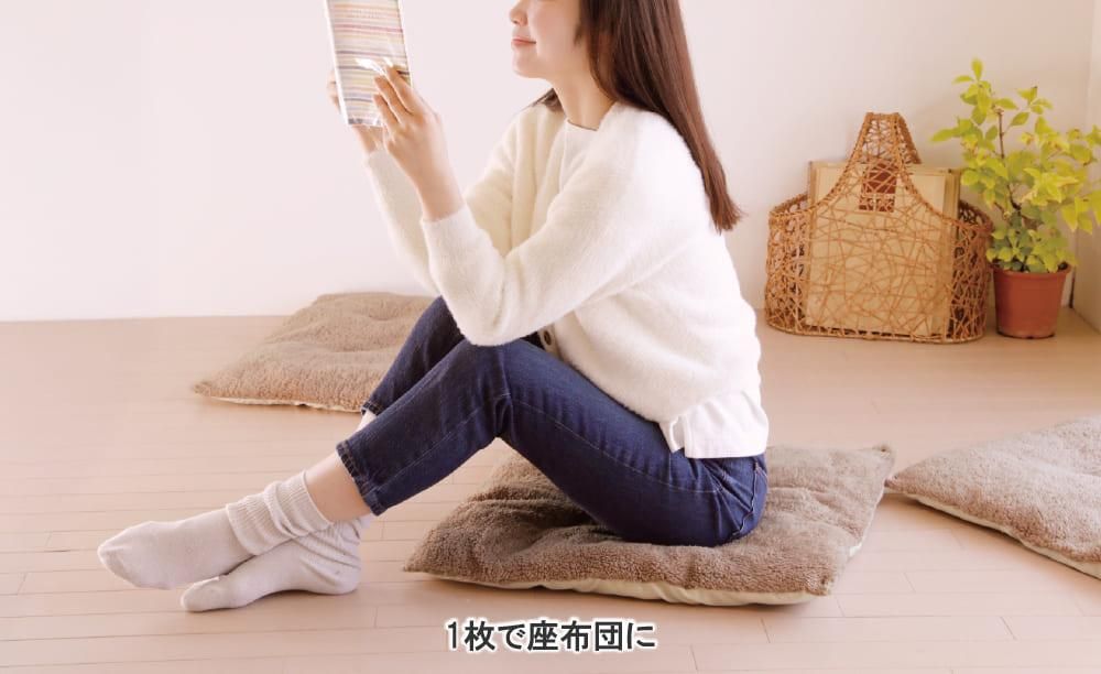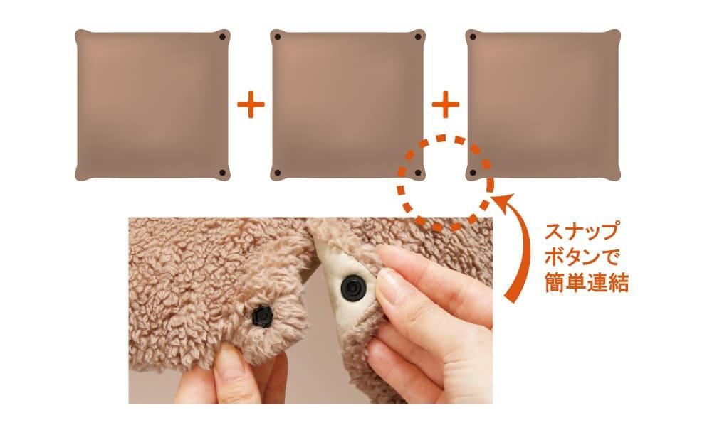 ふわふわ柔らかい中綿とあったか極暖生地。床に敷いてゴロンと横になると、ついついうたた寝してしまう心地よさ。スナップボタンで簡単に連結でき、様々なシーンで活躍します。