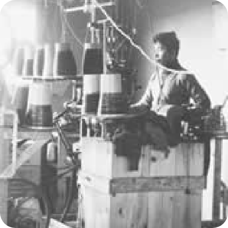 戦後まもない時代、4人兄弟で事業を始め、メーカーの反対を押し切り、必死の説得の末に手に入れた「たった1台の編み機」が、すべての始まりでした。